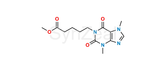 Pentoxifylline Impurity 1 is chemically Methyl 5-(3,7-dimethyl-2,6-dioxo-2,3,6,7-tetrahydro-1H-purin-1-yl)pentanoate. Pentoxifylline Impurity 1 is supplied with detailed characterization data compliant with regulatory guideline. Pentoxifylline Impurity 1 can be used for the analytical method development, method validation (AMV), Quality Controlled (QC) application for Abbreviated New Drug Application (ANDA) or during commercial production of Pentoxifylline.