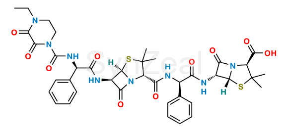 Nome Químico: (2S,5R,6R)-6-[(2R)-2-[(2S,5R,6R)-6-[(2R)-2-(4-ethyl-2,3-dioxopiperazine-1-carboxamido)-2-phenylacetamido]-3,3-dimethyl-7-oxo-4-thia-1-azabicyclo[3.2.0]heptane-2-carboxamido]-2-phenylacetamido]-3,3-dimethyl-7-oxo-4-thia-1-azabicyclo[3.2.0]heptane-2-carboxylic acid (as per EP);(2S,5R,6R)-6-((R)-2-{(2S,5R,6R)-6-[(R)-2-(4-Ethyl-2,3-dioxopiperazine-1-carboxamido)-2-phenylacetamido]-3,3-dimethyl-7-oxo-4-thia-1-azabicyclo[3.2.0]heptane-2-carboxamido}-2-phenylacetamido)-3,3-dimethyl-7-oxo-4-thia-1-azabicyclo[3.2.0]heptane-2-carboxylic acid (as per USP)