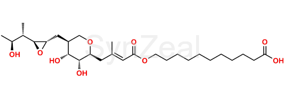 Pseudomonic acid E is chemically 11-{(E)-4-[(2S,3R,4R,5S)-3,4-Dihydroxy-5-({(2S,3S)-3-[(2S,3S)-3-hydrox-ybutan-2-yl]oxiran-2-yl}methyl)tetrahydro-2H-pyran-2-yl]-3-methylbut-2-enoyloxy}undecanoic acid (as per USP). Pseudomonic acid E is supplied with detailed characterization data compliant with regulatory guideline. Pseudomonic acid E can be used for the analytical method development, method validation (AMV), Quality Controlled (QC) application for Abbreviated New Drug Application (ANDA) or during commercial production of Mupirocin.