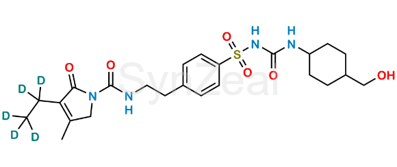rac trans-Hydroxy Glimepiride-D5 is chemically 3-(Ethyl-d5)-N-(4-(N-((4-(hydroxymethyl)cyclohexyl)carbamoyl)sulfamoyl)phenethyl)-4-methyl-2-oxo-2,5-dihydro-1H-pyrrole-1-carboxamide. rac trans-Hydroxy Glimepiride-D5 is supplied with detailed characterization data compliant with regulatory guideline. rac trans-Hydroxy Glimepiride-D5 can be used for the analytical method development, method validation (AMV), Quality Controlled (QC) application for Abbreviated New Drug Application (ANDA) or during commercial production of Glimepiride.