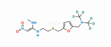 Ranitidine D6 is chemically (E)-N-(2-(((5-((bis(methyl-d3)amino)methyl)furan-2-yl)methyl)thio)ethyl)-N'-methyl-2-nitroethene-1,1-diamine. Ranitidine D6 is supplied with detailed characterization data compliant with regulatory guideline. Ranitidine D6 can be used for the analytical method development, method validation (AMV), Quality Controlled (QC) application for Abbreviated New Drug Application (ANDA) or during commercial production of Ranitidine.