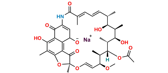Nome Químico: 5,17,19,21-Tetrahydroxy-23-methoxy-2,4,12,16,18,20,22-heptamethyl-2,7-(epoxypentadeca[1,11,13]trienimino)naphtho[2,1-b]furan-1,6,9,11(2H)-tetrone 21-Acetate; 1,4-Dideoxy-1,4-dihydro-1,4-dioxo-rifamycin Sodium Salt