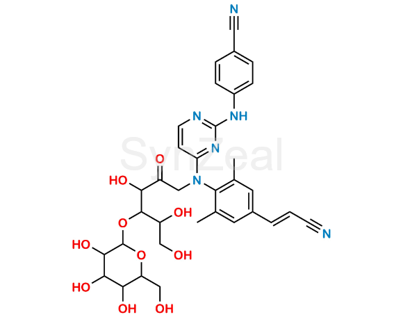 Rilpivirine Glycosamine and Amadori Rearrangement product-I is chemically (E)-4-((4-((4-(2-cyanovinyl)-2,6-dimethylphenyl)(3,5,6-trihydroxy-2-oxo-4-((3,4,5-trihydroxy-6-(hydroxymethyl)tetrahydro-2H-pyran-2-yl)oxy)hexyl)amino)pyrimidin-2-yl)amino)benzonitrile. Rilpivirine Glycosamine and Amadori Rearrangement product-I is supplied with detailed characterization data compliant with regulatory guideline. Rilpivirine Glycosamine and Amadori Rearrangement product-I can be used for the analytical method development, method validation (AMV), Quality Controlled (QC) application for Abbreviated New Drug Application (ANDA) or during commercial production of Rilpivirine .