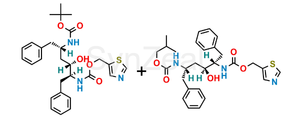 Ritonavir Impurity J + K (Mixture of Boc-Amino Alcohol and Isobutoxy Carbonyl Amino Alcohol is chemically Tert-butyl (thiazol-5-ylmethyl) ((2S,3S,5S)-3-hydroxy-1,6-diphenylhexane-2,5-diyl)dicarbamate compound with isobutyl (thiazol-5-ylmethyl) ((2S,3S,5S)-3-hydroxy-1,6-diphenylhexane-2,5-diyl)dicarbamate (1:1). Ritonavir Impurity J + K (Mixture of Boc-Amino Alcohol and Isobutoxy Carbonyl Amino Alcohol is supplied with detailed characterization data compliant with regulatory guideline. Ritonavir Impurity J + K (Mixture of Boc-Amino Alcohol and Isobutoxy Carbonyl Amino Alcohol can be used for the analytical method development, method validation (AMV), Quality Controlled (QC) application for Abbreviated New Drug Application (ANDA) or during commercial production of Ritonavir.