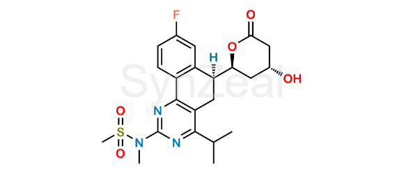 Rosuvastatin (6S)-Lactone Impurity is chemically N-[(6S)-8-Fluoro-5,6-dihydro-4-(1-methylethyl)-6-[(2S,4R)-tetrahydro-4-hydroxy-6-oxo-2H-pyran-2-yl]benzo[h]quinazolin-2-yl]-N-methylmethane sulfonamide. Rosuvastatin (6S)-Lactone Impurity is supplied with detailed characterization data compliant with regulatory guideline. Rosuvastatin (6S)-Lactone Impurity can be used for the analytical method development, method validation (AMV), Quality Controlled (QC) application for Abbreviated New Drug Application (ANDA) or during commercial production of Rosuvastatin.