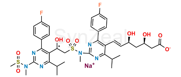Rosuvastatin EP Impurity E (Sodium Salt) is chemically (3R,5S,6E)-7-[4-(4-Fluorophenyl)-6-(1-methylethyl)-2-[methyl (2-[4-(4-fluorophenyl)-6-(1-methylethyl)-2-(methyl (methylsulfonyl)amino]-5-pyrimidinyl]-2-hydroxy-ethylsulfonyl)amino)-5-pyrimidinyl]-3,5-dihydroxy- 6-heptenoic acid Sodium salt ; . It is also known as Rosuvastatin USP Related Compound B. Rosuvastatin EP Impurity E (Sodium Salt) is supplied with detailed characterization data compliant with regulatory guideline. Rosuvastatin EP Impurity E (Sodium Salt) can be used for the analytical method development, method validation (AMV), Quality Controlled (QC) application for Abbreviated New Drug Application (ANDA) or during commercial production of Rosuvastatin.