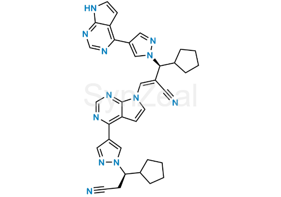 Ruxolitinib Impurity 16 is chemically (Z)-2-((S)-(4-(7H-pyrrolo[2,3-d]pyrimidin-4-yl)-1H-pyrazol-1-yl)(cyclopentyl)methyl)-3-(4-(1-((R)-2-cyano-1-cyclopentylethyl)-1H-pyrazol-4-yl)-7H-pyrrolo[2,3-d]pyrimidin-7-yl)acrylonitrile. Ruxolitinib Impurity 16 is supplied with detailed characterization data compliant with regulatory guideline. Ruxolitinib Impurity 16 can be used for the analytical method development, method validation (AMV), Quality Controlled (QC) application for Abbreviated New Drug Application (ANDA) or during commercial production of Ruxolitinib.