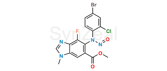 Selumetinib Nitroso Impurity 1 is chemically Methyl 5-((4-bromo-2-chlorophenyl)(nitroso)amino)-4-fluoro-1-methyl-1H-benzo[d]imidazole-6-carboxylate. Selumetinib Nitroso Impurity 1 is supplied with detailed characterization data compliant with regulatory guideline. Selumetinib Nitroso Impurity 1 can be used for the analytical method development, method validation (AMV), Quality Controlled (QC) application for Abbreviated New Drug Application (ANDA) or during commercial production of Selumetinib.