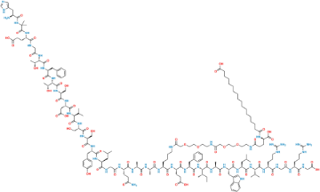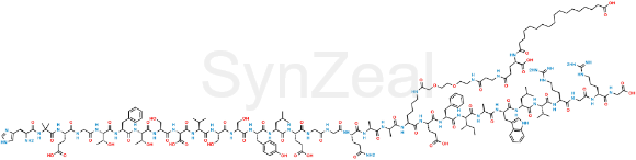 Semaglutide Impurity 12 is chemically (3S,9S,12S,15S,18S,21S,24S,27S,30S,33S,36S,39S,48S,51S,54R,57S,79R)-57-(((6S,12S,15S,18S,21S,24S,30S,33S)-21-((1H-indol-3-yl)methyl)-1-amino-30-benzyl-27-((S)-sec-butyl)-35-carboxy-6-((carboxymethyl)carbamoyl)-12-(3-guanidinopropyl)-1-imino-18-isobutyl-15-isopropyl-24-methyl-8,11,14,17,20,23,26,29,32-nonaoxo-2,7,10,13,16,19,22,25,28,31-decaazapentatriacontan-33-yl)carbamoyl)-3-(2-((S)-2-amino-3-(1H-imidazol-4-yl)propanamido)-2-methylpropanamido)-48-(3-amino-3-oxopropyl)-12-benzyl-39-(2-carboxyethyl)-33-(4-hydroxybenzyl)-9,15-bis((R)-1-hydroxyethyl)-18,27,30-tris(hydroxymethyl)-36-isobutyl-24-isopropyl-51,54-dimethyl-4,7,10,13,16,19,22,25,28,31,34,37,40,43,46,49,52,55,63,72,76,81-docosaoxo-65,68-dioxa-5,8,11,14,17,20,23,26,29,32,35,38,41,44,47,50,53,56,62,71,75,80-docosaazaheptanonacontane-1,21,79,97-tetracarboxylic acid. Semaglutide Impurity 12 is supplied with detailed characterization data compliant with regulatory guideline. Semaglutide Impurity 12 can be used for the analytical method development, method validation (AMV), Quality Controlled (QC) application for Abbreviated New Drug Application (ANDA) or during commercial production of Semaglutide.