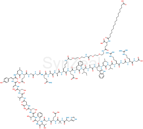 Semaglutide Impurity 9 is chemically (3S,9S,12S,15S,18S,21S,25S,28S,31S,34S,37S,40S,49S,52S,55R,58S)-58-(((6S,12S,15S,18S,21S,24S,30S,33S)-21-((1H-indol-3-yl)methyl)-1-amino-30-benzyl-27-((S)-sec-butyl)-35-carboxy-6-((carboxymethyl)carbamoyl)-12-(3-guanidinopropyl)-1-imino-18-isobutyl-15-isopropyl-24-methyl-8,11,14,17,20,23,26,29,32-nonaoxo-2,7,10,13,16,19,22,25,28,31-decaazapentatriacontan-33-yl)carbamoyl)-3-(2-((S)-2-amino-3-(1H-imidazol-4-yl)propanamido)-2-methylpropanamido)-49-(3-amino-3-oxopropyl)-12-benzyl-40-(2-carboxyethyl)-34-(4-hydroxybenzyl)-9,15-bis((R)-1-hydroxyethyl)-18,28,31-tris(hydroxymethyl)-37-isobutyl-25-isopropyl-52,55-dimethyl-4,7,10,13,16,19,23,26,29,32,35,38,41,44,47,50,53,56,64,73,82,87-docosaoxo-66,69,75,78-tetraoxa-5,8,11,14,17,20,24,27,30,33,36,39,42,45,48,51,54,57,63,72,81,86-docosaazatrihectane-1,21,85,103-tetracarboxylic acid. Semaglutide Impurity 9 is supplied with detailed characterization data compliant with regulatory guideline. Semaglutide Impurity 9 can be used for the analytical method development, method validation (AMV), Quality Controlled (QC) application for Abbreviated New Drug Application (ANDA) or during commercial production of Semaglutide.