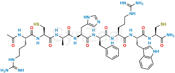 Setmelanotide Impurity 1 is chemically (S)-N-((2R,5S,8S,11R,14S,17R,20R)-14-((1H-imidazol-5-yl)methyl)-5-((1H-indol-3-yl)methyl)-1-amino-11-benzyl-8-(3-guanidinopropyl)-21-mercapto-2-(mercaptomethyl)-17-methyl-1,4,7,10,13,16,19-heptaoxo-3,6,9,12,15,18-hexaazahenicosan-20-yl)-2-acetamido-5-guanidinopentanamide. Setmelanotide Impurity 1 is supplied with detailed characterization data compliant with regulatory guideline. Setmelanotide Impurity 1 can be used for the analytical method development, method validation (AMV), Quality Controlled (QC) application for Abbreviated New Drug Application (ANDA) or during commercial production of Setmelanotide.