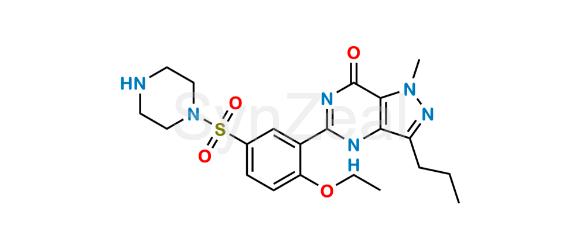 Sildenafil EP Impurity F is chemically 5-[2-ethoxy-5-(piperazine-1-sulfonyl)phenyl]-1-methyl-3-propyl-1,6-dihydro-7H-pyrazolo[4,3-d]pyrimidin-7-one, (as per EP). It is also known as N-Desmethyl Sildenafil. Sildenafil EP Impurity F is supplied with detailed characterization data compliant with regulatory guideline. Sildenafil EP Impurity F can be used for the analytical method development, method validation (AMV), Quality Controlled (QC) application for Abbreviated New Drug Application (ANDA) or during commercial production of Sildenafil .
