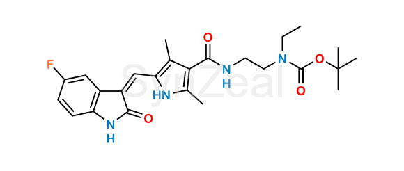 Sunitinib N-Desethyl N-Butoxycarbonyl Impurity is chemically N-[2-(N-Tert-Butoxycarbonylethylamino)ethyl]-5-[(Z)-(5-fluoro-1,2-dihydro-2-oxo-3H-indol-3-ylidene)methyl]-2,4-dimethyl-1H-pyrrole-3-carboxamide ; . Sunitinib N-Desethyl N-Butoxycarbonyl Impurity is supplied with detailed characterization data compliant with regulatory guideline. Sunitinib N-Desethyl N-Butoxycarbonyl Impurity can be used for the analytical method development, method validation (AMV), Quality Controlled (QC) application for Abbreviated New Drug Application (ANDA) or during commercial production of Sunitinib .