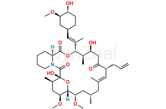 Tacrolimus Impurity 1 is chemically [3S-[3R*[E(1S*,3S*,4S*)],4S*,5R*,8S*,9E,12R*,14R*,15S*,16R*,18S*,19S*,25aR*]]- 3,4,5,6,8,11,12,13,14,15,16,17,18,19,23,24,25,25a-Octadecahydro-5,19-dihydroxy-3-[2-(4-hydroxy-3-methoxycyclohexyl)-1-methylethenyl]-14,16-dimethoxy-4,10,12,18-tetramethyl-8-(2-propenyl)-15,19-epoxypyrido[2,1-c][1,4]oxaazacyclodocosine-1,7,20(22H)-trione. Tacrolimus Impurity 1 is supplied with detailed characterization data compliant with regulatory guideline. Tacrolimus Impurity 1 can be used for the analytical method development, method validation (AMV), Quality Controlled (QC) application for Abbreviated New Drug Application (ANDA) or during commercial production of Tacrolimus.