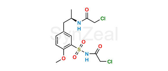 Tamsulosin Sulfonamide Chloroacetyl is chemically (R)-2-Chloro-N-((5-(2-(2-chloroacetamido)propyl)-2-methoxyphenyl)sulfonyl)acetamide. Tamsulosin Sulfonamide Chloroacetyl is supplied with detailed characterization data compliant with regulatory guideline. Tamsulosin Sulfonamide Chloroacetyl can be used for the analytical method development, method validation (AMV), Quality Controlled (QC) application for Abbreviated New Drug Application (ANDA) or during commercial production of Tamsulosin.