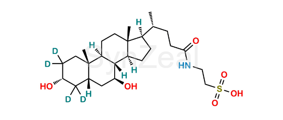 Tauroursodeoxycholic Acid-d4 is chemically 2-((R)-4-((3R,5S,7S,8R,9S,10S,13R,14S,17R)-3,7-Dihydroxy-10,13-dimethylhexadecahydro-1H-cyclopenta[a]phenanthren-17-yl-2,2,4,4-d4)pentanamido)ethane-1-sulfonic acid. Tauroursodeoxycholic Acid-d4 is supplied with detailed characterization data compliant with regulatory guideline. Tauroursodeoxycholic Acid-d4 can be used for the analytical method development, method validation (AMV), Quality Controlled (QC) application for Abbreviated New Drug Application (ANDA) or during commercial production of Ursodeoxycholic.