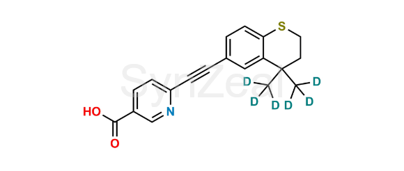 Tazarotenic Acid-D6 is chemically 6-((4,4-Bis(Methyl-d3)thiochroman-6-yl)ethynyl)nicotinic Acid. Tazarotenic Acid-D6 is supplied with detailed characterization data compliant with regulatory guideline. Tazarotenic Acid-D6 can be used for the analytical method development, method validation (AMV), Quality Controlled (QC) application for Abbreviated New Drug Application (ANDA) or during commercial production of Tazarotene.