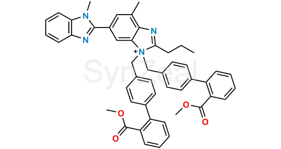Telmisartan Impurity 46 is chemically 3',3'-Bis((2'-(methoxycarbonyl)-[1,1'-biphenyl]-4-yl)methyl)-1,7'-dimethyl-2'-propyl-1H,3'H-[2,5'-bibenzo[d]imidazol]-3'-ium. Telmisartan Impurity 46 is supplied with detailed characterization data compliant with regulatory guideline. Telmisartan Impurity 46 can be used for the analytical method development, method validation (AMV), Quality Controlled (QC) application for Abbreviated New Drug Application (ANDA) or during commercial production of Telmisartan.