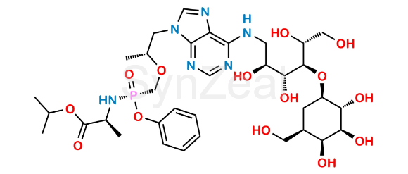 Nome Químico: Isopropyl ((S)-phenoxy((((R)-1-(6-(((2S,3R,4R,5R)-2,3,5,6-tetrahydroxy-4-(((1R,2R,3S,4S,5R)-2,3,4-trihydroxy-5-(hydroxymethyl)cyclohexyl)oxy)hexyl)amino)-9H-purin-9-yl)propan-2-yl)oxy)methyl)phosphoryl)-L-alaninate