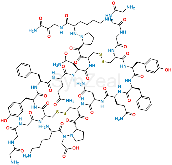 Terlipressin Antiparallel Dimer is chemically N-(L-lysyl)-N-((S)-2-(2-((4R,7S,10S,13S,16S,19R,24R,27S,30S,33S,36S,39R)-24-(2-((S)-1-(((S)-6-amino-1-((3-amino-2,3-dioxopropyl)amino)-1-oxohexan-2-yl)amino)pyrrolidin-2-yl)-2-oxoacetyl)-7,27-bis(2-amino-2-oxoethyl)-10,30-bis(3-amino-3-oxopropyl)-19,39-bis(2-(2-(2-aminoacetamido)acetamido)acetamido)-13,33-dibenzyl-16,36-bis(4-hydroxybenzyl)-6,9,12,15,18,26,29,32,35,38-decaoxo-1,2,21,22-tetrathia-5,8,11,14,17,25,28,31,34,37-decaazacyclotetracontan-4-yl)-2-oxoacetyl)pyrrolidin-1-yl)glycine. Terlipressin Antiparallel Dimer is supplied with detailed characterization data compliant with regulatory guideline. Terlipressin Antiparallel Dimer can be used for the analytical method development, method validation (AMV), Quality Controlled (QC) application for Abbreviated New Drug Application (ANDA) or during commercial production of Terlipressin.