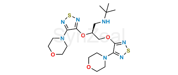 Timolol Impurity 5 is chemically (S)-N-(tert-butyl)-2,3-bis((4-morpholino-1,2,5-thiadiazol-3-yl)oxy)propan-1-amine. Timolol Impurity 5 is supplied with detailed characterization data compliant with regulatory guideline. Timolol Impurity 5 can be used for the analytical method development, method validation (AMV), Quality Controlled (QC) application for Abbreviated New Drug Application (ANDA) or during commercial production of Timolol.