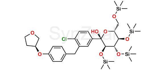TMSO Hydroxy Empagliflozin is chemically (2S,3R,4S,5R,6R)-2-(4-chloro-3-(4-(((S)-tetrahydrofuran-3-yl)oxy)benzyl)phenyl)-3,4,5-tris((trimethylsilyl)oxy)-6-(((trimethylsilyl)oxy)methyl)tetrahydro-2H-pyran-2-ol. TMSO Hydroxy Empagliflozin is supplied with detailed characterization data compliant with regulatory guideline. TMSO Hydroxy Empagliflozin can be used for the analytical method development, method validation (AMV), Quality Controlled (QC) application for Abbreviated New Drug Application (ANDA) or during commercial production of Empagliflozin.