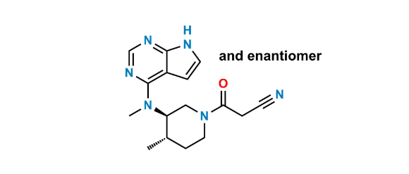 Tofacitinib Trans Impurity is chemically 3-((3RS,4SR)-4-methyl-3-(methyl(7H-pyrrolo[2,3-d]pyrimidin-4-yl)amino)piperidin-1-yl)-3-oxopropanenitrile. It is also known as Tofacitinib Diastereomer Mixture. Tofacitinib Trans Impurity is supplied with detailed characterization data compliant with regulatory guideline. Tofacitinib Trans Impurity can be used for the analytical method development, method validation (AMV), Quality Controlled (QC) application for Abbreviated New Drug Application (ANDA) or during commercial production of Tofacitinib.
