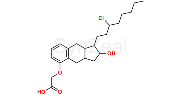 Treprostinil Impurity 6 is chemically 2-((1-(3-chlorooctyl)-2-hydroxy-2,3,3a,4,9,9a-hexahydro-1H-cyclopenta[b]naphthalen-5-yl)oxy)acetic acid. Treprostinil Impurity 6 is supplied with detailed characterization data compliant with regulatory guideline. Treprostinil Impurity 6 can be used for the analytical method development, method validation (AMV), Quality Controlled (QC) application for Abbreviated New Drug Application (ANDA) or during commercial production of Treprostinil.