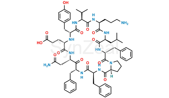 Nome Químico: 3-((3S,6R,8S,11S,13R,16S,19S,22S,25R,30aS)-8-(2-amino-2-oxoethyl)-19-(3-aminopropyl)-3,6,25-tribenzyl-13-(4-hydroxybenzyl)-22-isobutyl-16-isopropyl-1,4,7,10,14,17,20,23,26-nonaoxotriacontahydropyrrolo[2,1-f][1,4,7,10,13,16,19,22,25]nonaazacyclooctacosin-11-yl)propanoic acid