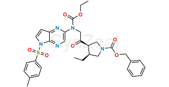 Upadacitinib Impurity 33 is chemically Benzyl (3R,4S)-3-(N-(ethoxycarbonyl)-N-(5-tosyl-5H-pyrrolo[2,3-b]pyrazin-2-yl)glycyl)-4-ethylpyrrolidine-1-carboxylate. Upadacitinib Impurity 33 is supplied with detailed characterization data compliant with regulatory guideline. Upadacitinib Impurity 33 can be used for the analytical method development, method validation (AMV), Quality Controlled (QC) application for Abbreviated New Drug Application (ANDA) or during commercial production of Upadacitinib.