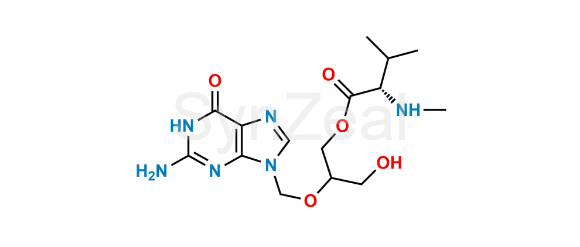 Nome Químico: (2RS)-2-[(2-amino-6-oxo-1,6-dihydro-9H-purin-9-yl)methoxy]-3-hydroxypropyl N-methyl-L-valinate (as per EP) ; 2-(RS)-[(Guanin-9-yl)methoxy]-3-hydroxypropyl N-methyl-l-valinate. (as per USP)