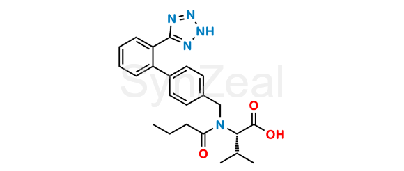 Valsartan EP Impurity C is chemically [(S-N-Butyryl-N-([2'-(1H-tetrazole-5-yl)biphen-4-yl]methyl)-valine. It is also known as Valsartan USP Related Compound B ; Valsartan N-Butyryl Analog. Valsartan EP Impurity C is supplied with detailed characterization data compliant with regulatory guideline. Valsartan EP Impurity C can be used for the analytical method development, method validation (AMV), Quality Controlled (QC) application for Abbreviated New Drug Application (ANDA) or during commercial production of Valsartan .