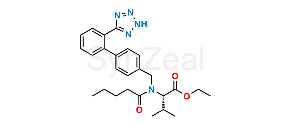 Valsartan Ethyl Ester is chemically (S)-N-Valeryl-N-([2'-(1H-tetrazole-5-yl)biphen-6-yl]methyl)-valine ethyl ester. Valsartan Ethyl Ester is supplied with detailed characterization data compliant with regulatory guideline. Valsartan Ethyl Ester can be used for the analytical method development, method validation (AMV), Quality Controlled (QC) application for Abbreviated New Drug Application (ANDA) or during commercial production of Valsartan .
