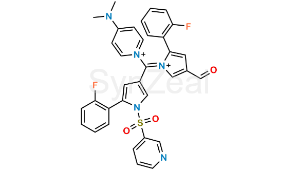 Vonoprazan Dimer Impurity 1 is chemically (Z)-4-(Dimethylamino)-1-((5-(2-fluorophenyl)-1-(pyridin-3-ylsulfonyl)-1H-pyrrol-3-yl)(2-(2-fluorophenyl)-4-formyl-1H-pyrrol-1-ium-1-ylidene)methyl)pyridin-1-ium. Vonoprazan Dimer Impurity 1 is supplied with detailed characterization data compliant with regulatory guideline. Vonoprazan Dimer Impurity 1 can be used for the analytical method development, method validation (AMV), Quality Controlled (QC) application for Abbreviated New Drug Application (ANDA) or during commercial production of Vonoprazan.