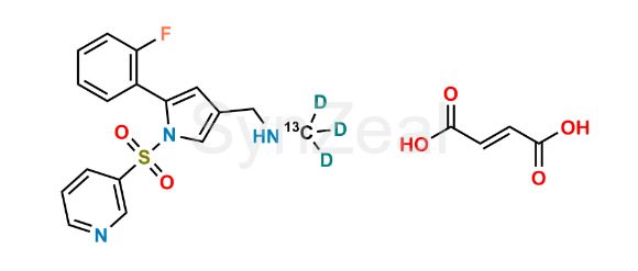 Vonoprazan Fumarate 13C D3 is chemically N-((5-(2-fluorophenyl)-1-(pyridin-3-ylsulfonyl)-1H-pyrrol-3-yl)methyl)methan-13C-d3-amine fumarate. Vonoprazan Fumarate 13C D3 is supplied with detailed characterization data compliant with regulatory guideline. Vonoprazan Fumarate 13C D3 can be used for the analytical method development, method validation (AMV), Quality Controlled (QC) application for Abbreviated New Drug Application (ANDA) or during commercial production of Vonoprazan.