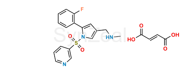 Vonoprazan Fumarate is chemically 1-(5-(2-Fluorophenyl)-1-(pyridin-3-ylsulfonyl)-1H-pyrrol-3-yl)-N-methylmethanamine fumarate. Vonoprazan Fumarate is supplied with detailed characterization data compliant with regulatory guideline. Vonoprazan Fumarate can be used for the analytical method development, method validation (AMV), Quality Controlled (QC) application for Abbreviated New Drug Application (ANDA) or during commercial production of Vonoprazan.