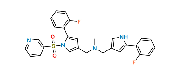 Vonoprazan Impurity 11 is chemically 1-(5-(2-Fluorophenyl)-1-(pyridin-3-ylsulfonyl)-1H-pyrrol-3-yl)-N-((5-(2-fluorophenyl)-1H-pyrrol-3-yl)methyl)-N-methylmethanamine. Vonoprazan Impurity 11 is supplied with detailed characterization data compliant with regulatory guideline. Vonoprazan Impurity 11 can be used for the analytical method development, method validation (AMV), Quality Controlled (QC) application for Abbreviated New Drug Application (ANDA) or during commercial production of Vonoprazan.