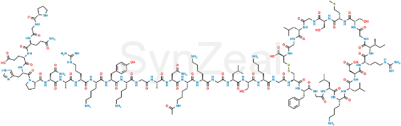 Vosoritide Lysin-16 Amine Acetylated is chemically (4R,10S,16S,19S,22S,28S,31S,34S,37S,40S,43S,49S,52R)-52-(2-((S)-2-((S)-2-((S)-2-(2-((S)-2-((S)-2-((S)-2-((S)-2-(2-((S)-2-((S)-2-((S)-2-((S)-2-((S)-2-((S)-2-((S)-1-(L-prolylglycyl-L-glutaminyl-L-glutamyl-L-histidyl)pyrrolidine-2-carboxamido)-4-amino-4-oxobutanamido)propanamido)-5-guanidinopentanamido)-6-aminohexanamido)-3-(4-hydroxyphenyl)propanamido)-6-aminohexanamido)acetamido)propanamido)-4-amino-4-oxobutanamido)-6-acetamidohexanamido)-6-aminohexanamido)acetamido)-4-methylpentanamido)-3-hydroxypropanamido)-6-aminohexanamido)acetamido)-40-(4-aminobutyl)-49-benzyl-28-((S)-sec-butyl)-34-(carboxymethyl)-31-(3-guanidinopropyl)-16,22-bis(hydroxymethyl)-10,37,43-triisobutyl-19-(2-(methylthio)ethyl)-6,9,12,15,18,21,24,27,30,33,36,39,42,45,48,51-hexadecaoxo-1,2-dithia-5,8,11,14,17,20,23,26,29,32,35,38,41,44,47,50-hexadecaazacyclotripentacontane-4-carboxylic acid. Vosoritide Lysin-16 Amine Acetylated is supplied with detailed characterization data compliant with regulatory guideline. Vosoritide Lysin-16 Amine Acetylated can be used for the analytical method development, method validation (AMV), Quality Controlled (QC) application for Abbreviated New Drug Application (ANDA) or during commercial production of Vosoritide.