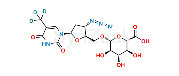 Zidovudine-5-Glucuronide D3 is chemically (2S,3S,4S,5R,6R)-6-(((2S,3S,5R)-3-Azido-5-(5-(methyl-d3)-2,4-dioxo-3,4-dihydropyrimidin-1(2H)-yl)tetrahydrofuran-2-yl)methoxy)-3,4,5-trihydroxytetrahydro-2H-pyran-2-carboxylic acid. Zidovudine-5-Glucuronide D3 is supplied with detailed characterization data compliant with regulatory guideline. Zidovudine-5-Glucuronide D3 can be used for the analytical method development, method validation (AMV), Quality Controlled (QC) application for Abbreviated New Drug Application (ANDA) or during commercial production of Zidovudine.