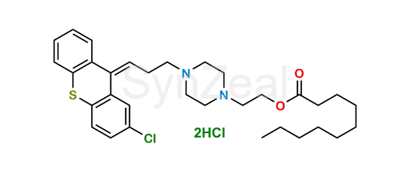 Zuclopenthixol Decanoate Dihydrochloride is chemically 2-[4-[3-[(9Z)-2-Chloro-9H-thioxanthen-9-ylidene]propyl]piperazin-1-yl]ethyl decanoate dihydrochloride (as per EP). Zuclopenthixol Decanoate Dihydrochloride is supplied with detailed characterization data compliant with regulatory guideline. Zuclopenthixol Decanoate Dihydrochloride can be used for the analytical method development, method validation (AMV), Quality Controlled (QC) application for Abbreviated New Drug Application (ANDA) or during commercial production of Zuclopenthixol Decanoate.