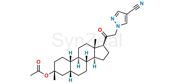 Zuranolone Acetate Impurity is chemically (3R,5R,8R,9R,10S,13S,14S,17S)-17-(2-(4-cyano-1H-pyrazol-1-yl)acetyl)-3,13-dimethylhexadecahydro-1H-cyclopenta[a]phenanthren-3-yl acetate. Zuranolone Acetate Impurity is supplied with detailed characterization data compliant with regulatory guideline. Zuranolone Acetate Impurity can be used for the analytical method development, method validation (AMV), Quality Controlled (QC) application for Abbreviated New Drug Application (ANDA) or during commercial production of Zuranolone.