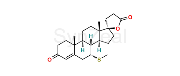 7-Alpha-Thiomethyl Spironolactone is chemically (7R,8R,9S,10R,13S,14S,17S)-10,13-Dimethyl-7-(methylthio)-1,3',4',6,7,8,9,10,11,12,13,14,15,16-tetradecahydro-5'H-spiro[cyclopenta[a]phenanthrene-17,2'-furan]-3,5'(2H)-dione. 7-Alpha-Thiomethyl Spironolactone is supplied with detailed characterization data compliant with regulatory guideline. 7-Alpha-Thiomethyl Spironolactone can be used for the analytical method development, method validation (AMV), Quality Controlled (QC) application for Abbreviated New Drug Application (ANDA) or during commercial production of Spironolactone.