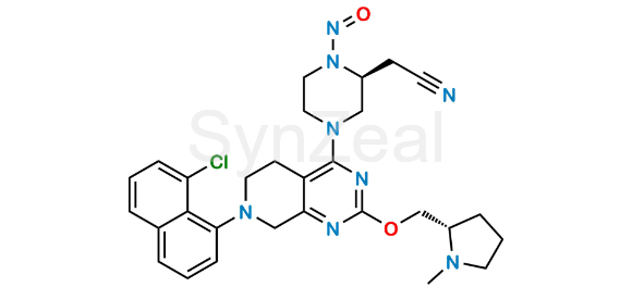 Adagrasib Nitroso Impurity 1 is chemically 2-((S)-4-(7-(8-Chloronaphthalen-1-yl)-2-(((S)-1-methylpyrrolidin-2-yl)methoxy)-5,6,7,8-tetrahydropyrido[3,4-d]pyrimidin-4-yl)-1-nitrosopiperazin-2-yl)acetonitrile. Adagrasib Nitroso Impurity 1 is supplied with detailed characterization data compliant with regulatory guideline. Adagrasib Nitroso Impurity 1 can be used for the analytical method development, method validation (AMV), Quality Controlled (QC) application for Abbreviated New Drug Application (ANDA) or during commercial production of Adagrasib.