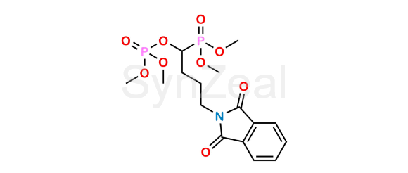 Alendronate Impurity 1 is chemically 1-(Dimethoxyphosphoryl)-4-(1,3-dioxoisoindolin-2-yl)butyl dimethyl phosphate. Alendronate Impurity 1 is supplied with detailed characterization data compliant with regulatory guideline. Alendronate Impurity 1 can be used for the analytical method development, method validation (AMV), Quality Controlled (QC) application for Abbreviated New Drug Application (ANDA) or during commercial production of Alendronate.