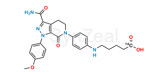 Apixaban Amino Acid 14C is chemically 5-((4-(3-Carbamoyl-1-(4-methoxyphenyl)-7-oxo-1,4,5,7-tetrahydro-6H-pyrazolo[3,4-c]pyridin-6-yl)phenyl)amino)pentanoic-1-14C acid. Apixaban Amino Acid 14C is supplied with detailed characterization data compliant with regulatory guideline. Apixaban Amino Acid 14C can be used for the analytical method development, method validation (AMV), Quality Controlled (QC) application for Abbreviated New Drug Application (ANDA) or during commercial production of Apixaban.