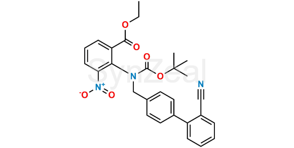 Azilsartan Impurity 40 is chemically Ethyl 2-((tert-butoxycarbonyl)((2'-cyano-[1,1'-biphenyl]-4-yl)methyl)amino)-3-nitrobenzoate. Azilsartan Impurity 40 is supplied with detailed characterization data compliant with regulatory guideline. Azilsartan Impurity 40 can be used for the analytical method development, method validation (AMV), Quality Controlled (QC) application for Abbreviated New Drug Application (ANDA) or during commercial production of Azilsartan.