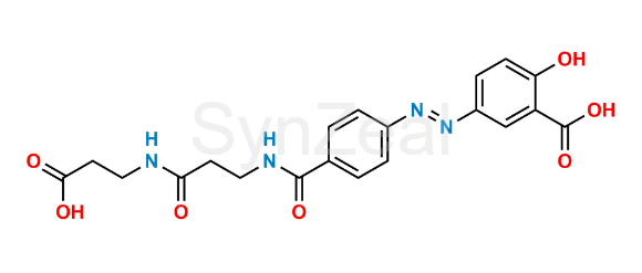 Balsalazide Impurity 9 is chemically (E)-5-((4-((3-((2-Carboxyethyl)amino)-3-oxopropyl)carbamoyl)phenyl)diazenyl)-2-hydroxybenzoic acid. Balsalazide Impurity 9 is supplied with detailed characterization data compliant with regulatory guideline. Balsalazide Impurity 9 can be used for the analytical method development, method validation (AMV), Quality Controlled (QC) application for Abbreviated New Drug Application (ANDA) or during commercial production of Balsalazide.