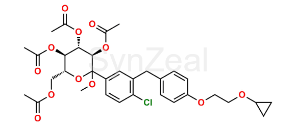Bexagliflozin O-Methyl Tetraacetyl Impurity is chemically (3R,4S,5R,6R)-6-(Acetoxymethyl)-2-(4-chloro-3-(4-(2-cyclopropoxyethoxy)benzyl)phenyl)-2-methoxytetrahydro-2H-pyran-3,4,5-triyl triacetate. Bexagliflozin O-Methyl Tetraacetyl Impurity is supplied with detailed characterization data compliant with regulatory guideline. Bexagliflozin O-Methyl Tetraacetyl Impurity can be used for the analytical method development, method validation (AMV), Quality Controlled (QC) application for Abbreviated New Drug Application (ANDA) or during commercial production of Bexagliflozin.