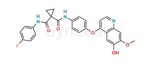 Cabozantinib Desmethyl Impurity 2 is chemically N-(4-fluorophenyl)-N-(4-((6-hydroxy-7-methoxyquinolin-4-yl)oxy)phenyl)cyclopropane-1,1-dicarboxamide. Cabozantinib Desmethyl Impurity 2 is supplied with detailed characterization data compliant with regulatory guideline. Cabozantinib Desmethyl Impurity 2 can be used for the analytical method development, method validation (AMV), Quality Controlled (QC) application for Abbreviated New Drug Application (ANDA) or during commercial production of Cabozantinib.
