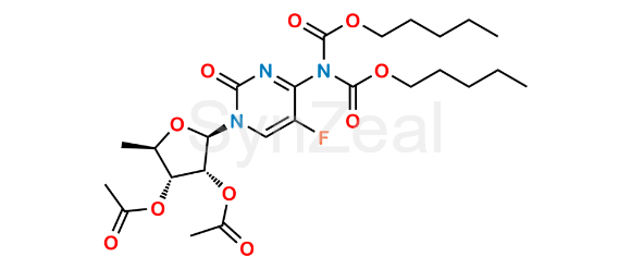 Capecitabine Impurity 4 is chemically Cytidine, 5'-deoxy-5-fluoro-N,N-bis[(pentyloxy)carbonyl]-, 2',3'-diacetate. Capecitabine Impurity 4 is supplied with detailed characterization data compliant with regulatory guideline. Capecitabine Impurity 4 can be used for the analytical method development, method validation (AMV), Quality Controlled (QC) application for Abbreviated New Drug Application (ANDA) or during commercial production of Capecitabine.